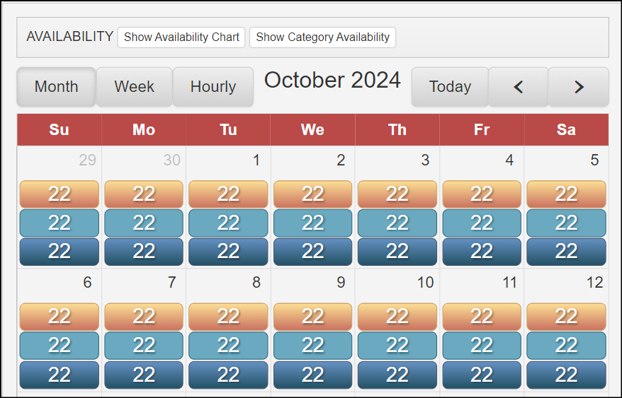 The Availability section can display item availability by month, week, or hour. The Show Category Availability button displays the availability of other items in the same category. The Show Availability Chart button allows the user to select a date range to view item availability.