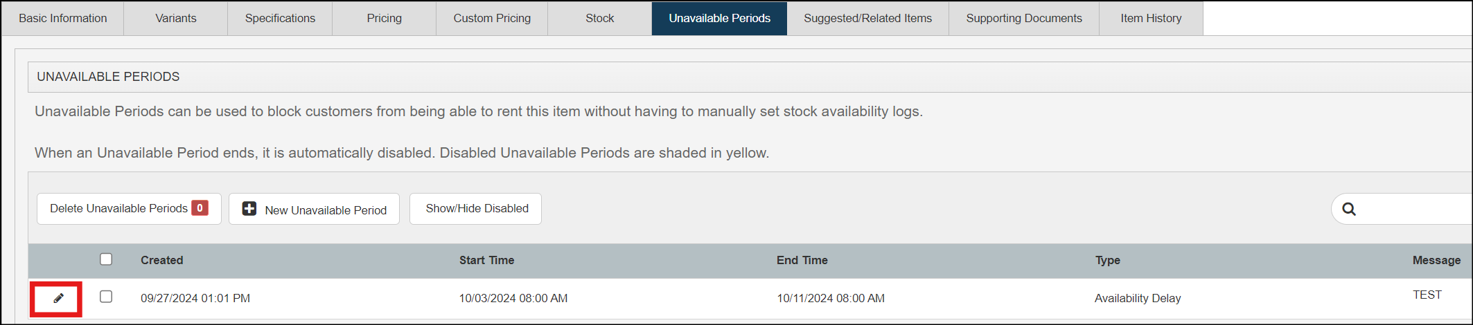 Once you're in ‘Unavailable Periods’ check the current Unavailability Periods to see if any are still active or expired.' To edit an Unavailability Period, click on the Edit icon (pencil icon) next to the desired period to edit.