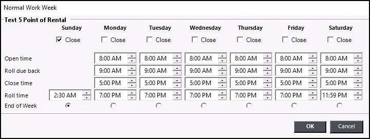 - After you enter the owner or manager’s level password, the normal work week for your store will be displayed. The open, close, roll, and roll due back times for a “normal” workweek are displayed. From this screen, you can set or update the normal open, close, roll due back, roll times, and end of the week. If you are closed on any day, check the “Closed” box under that day. You will still need to define the Roll time for the days you are closed.