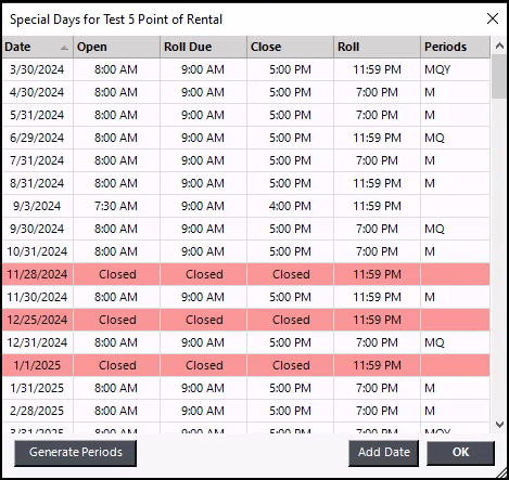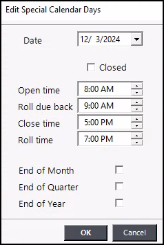 - To add a holiday, click on Add Date. Enter the date to be added and the open time, roll due, close time, and roll time. If you are closed on this date, checkmark the Closed box. Also, checkmark any end-of-period options for this date. Be especially careful if you are defining a date that you will be closed on (i.e., holiday) that falls at the end of the month, quarter, or year because you will have to define the previous business day as the end of that period.