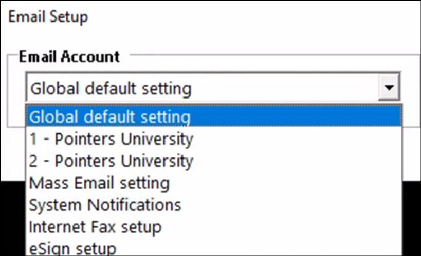 Global Default Setting This is the default option. If no other default email settings are set, everyone will use this email address. It would be a generic address such as info@(businessname).com. The example in Step 3 below shows how to configure this setting. Your Specific Store or Stores Select this option to configure or update an email for each store. You may use the same email account for each store. If you decide to do so, update the displaying phone and fax numbers in the signature (within the Signature area). Mass Email Setting Select this option to configure or update an email used for invoices and statements. Typically, an accounting email address would be set up for this option so that your customers see their invoices sent from an “Accounting” address rather than an operator's personal address. System Notifications Select this option to configure or update the emails used to send notifications. Notifications can be sent from Contracts and Sales Reps. For information on how to set these notifications, see the articles on Contract Notifications and Salesmen Notifications. Internet Fax Setup Select this option to configure or update an email address used to fax contracts, invoices, or statements to your customer. To use this feature, you must be licensed for the Mass/Fax/Email module and have the 3rd party software Metrofax. Your server will not need to have a fax modem installed. eSign Set Up Select this option to configure or update an email address that can be used for a specific store or all stores. This allows various types of notifications to be sent when an eSign is requested.