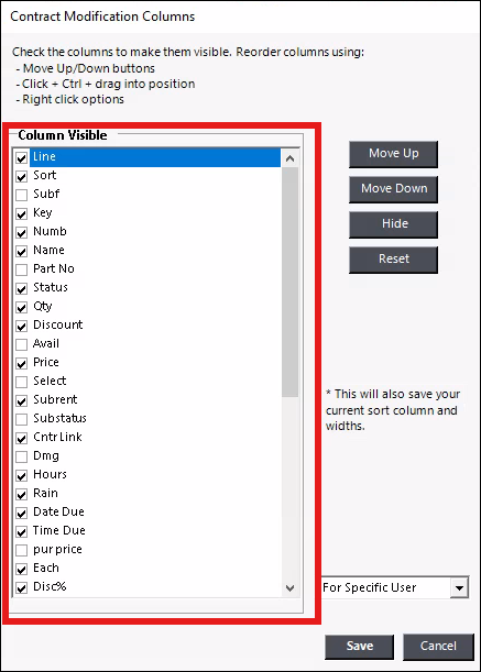 Moving Up/Down Click on an item and select the move up or down button to reposition the columns and their order of appearance on your contract. Right-clicking on a column lets you move it directly to the top or bottom. Holding down 'Ctrl' and using the page up/down keys or dragging and dropping will also move the column to the desired position. Searching Typing in this screen will search the columns and bring those that fit the search to the top, so you don't have to scroll the whole list to find the column you want to enable/disable. Hide Selecting this button will automatically check or uncheck the item you have highlighted. A checked box means it will display as a column on your contract, and unchecking will remove the column. Reset Selecting this button will reset the system's default setting.