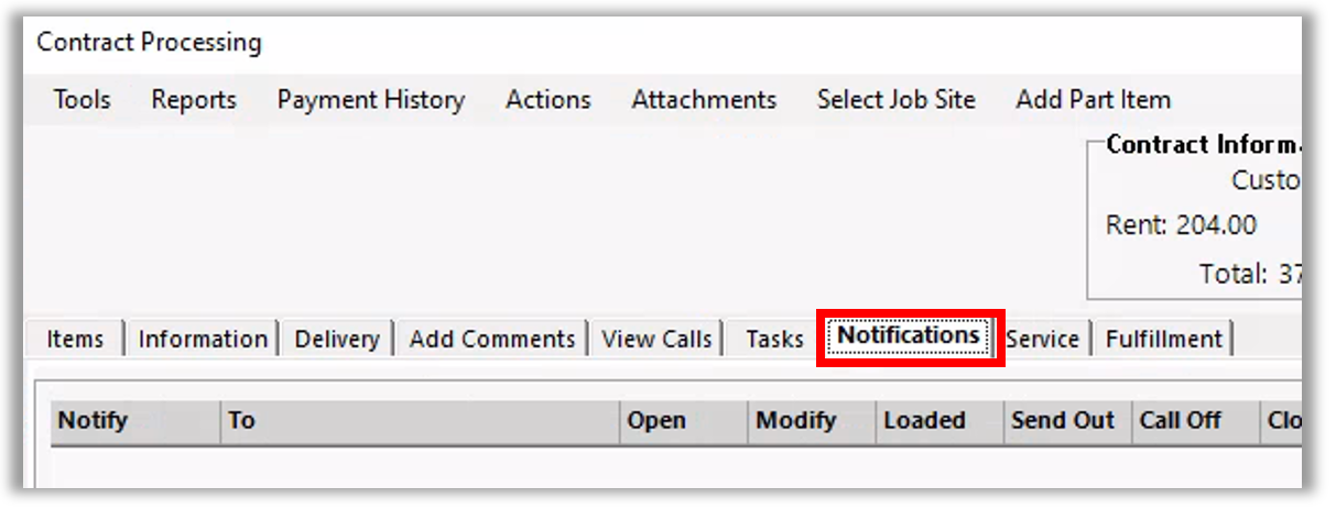 - From within the contract processing screen, click the Notifications tab.