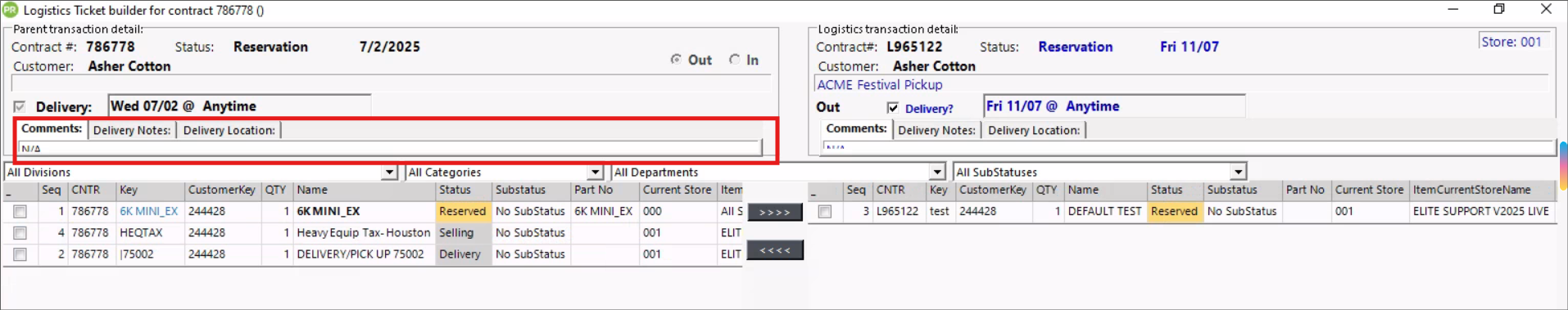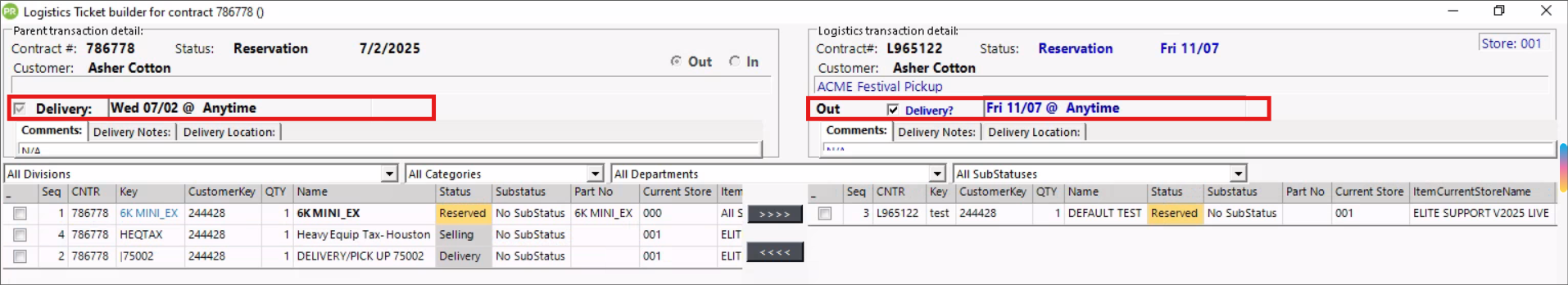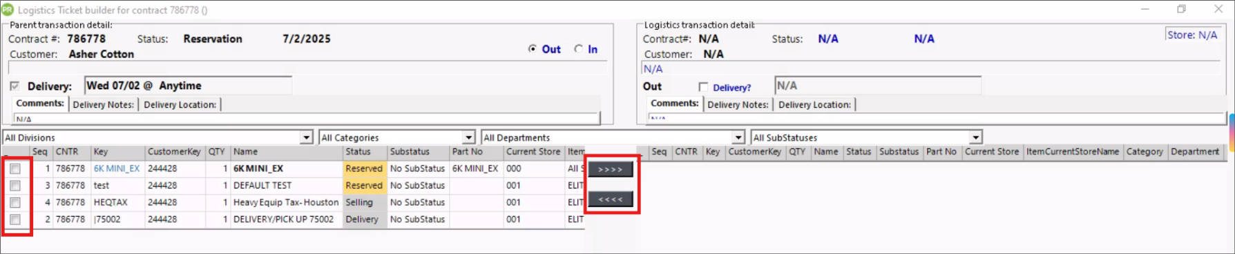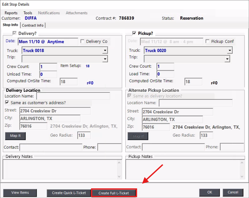 Select Out for a delivery or In for a pickup. Important! If Delivery/Pickup is not checked in the contract, the L-Ticket will not appear in the Dispatch Center.