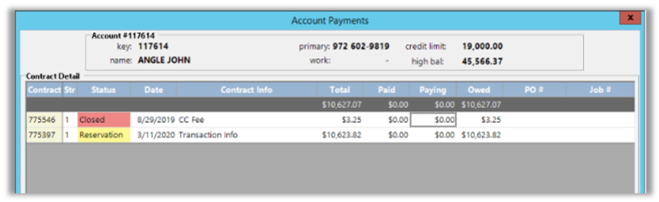 This fee is also charged on any account payments that are taken by credit card. When this occurs, a closed contract is automatically created to apply the credit card fee. In the example below, a $100 payment plus a 3% credit card fee was taken. The $100 would be applied against the reservation and the $3.25 against the closed CC Fee contract.