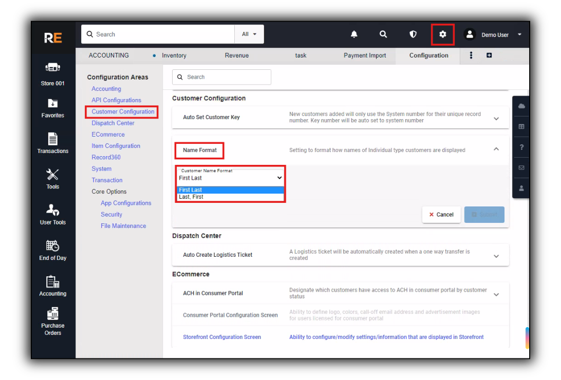 To get there, click the Configuration gear icon in the top right corner > Customer Configuration on the left side of the screen under Configuration Areas > Name Format > Customer Name Format dropdown.