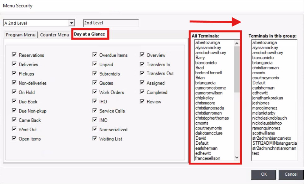 - Select the Security group from the dropdown and select each tab you want to be visible. Double-click the terminals under the "All Terminal" list to the "Terminals in this group" list on the left.