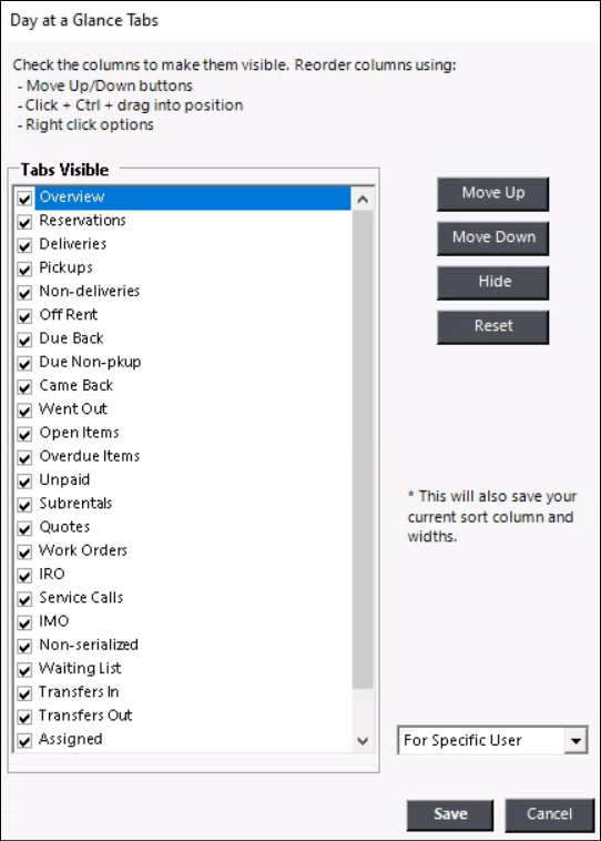 4. When you are finished making selections, press Save. Your selections will populate in Day at a Glance. These settings can be set for a specific user, as a store or company default.