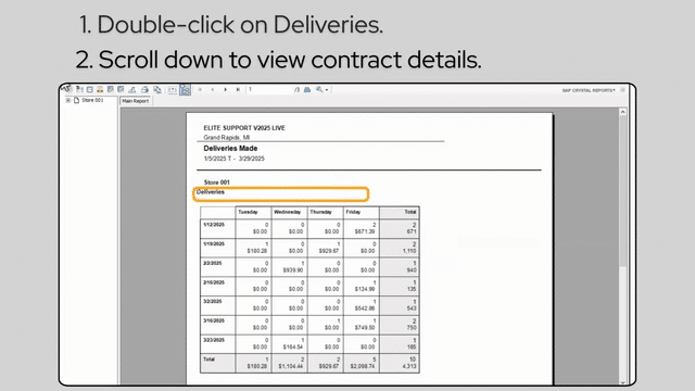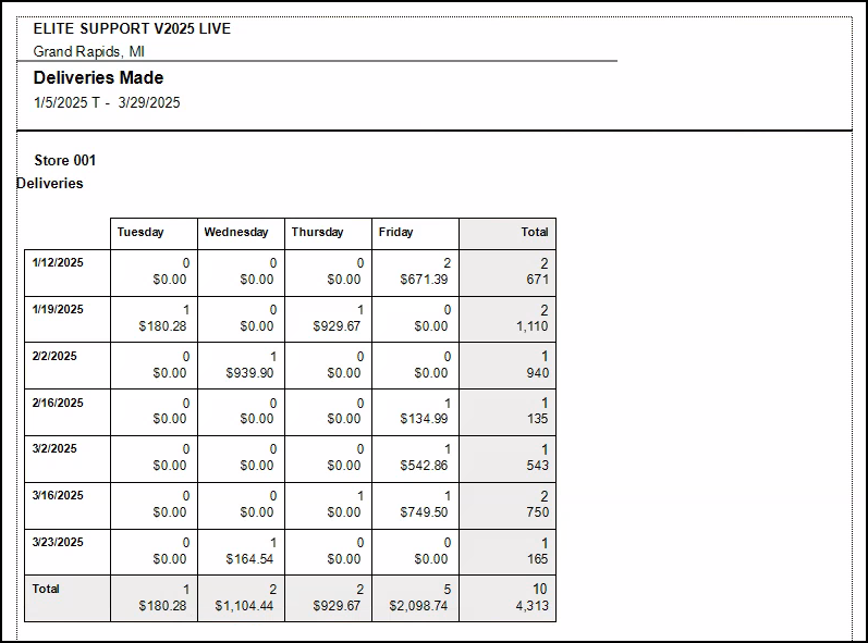 The Deliveries Made Analysis Report shows the number of deliveries made each day of the week, along with the total contract value for the selected date range. The report provides subtotals for each day and each week within that range. When running the report, you'll be prompted to choose the date range you want to view. Note that the report week always begins on Sunday, regardless of the system calendar settings in System Configuration. You can choose to view data for all stores or just the store you're currently in.