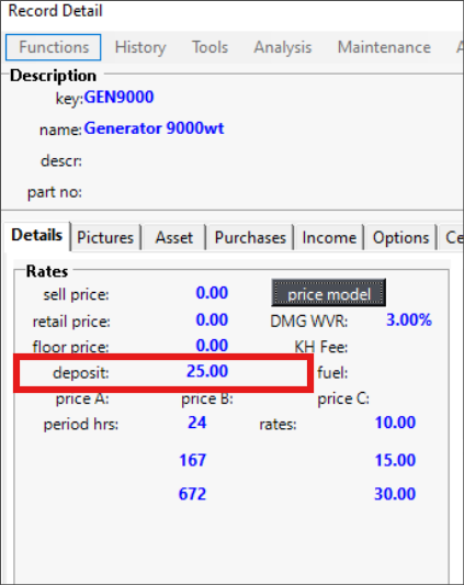 From within the Item record, you will need to enter a deposit for the item being entered on the contract. The deposit amount will only show in the rental/sale field from the deposit set in the item record.