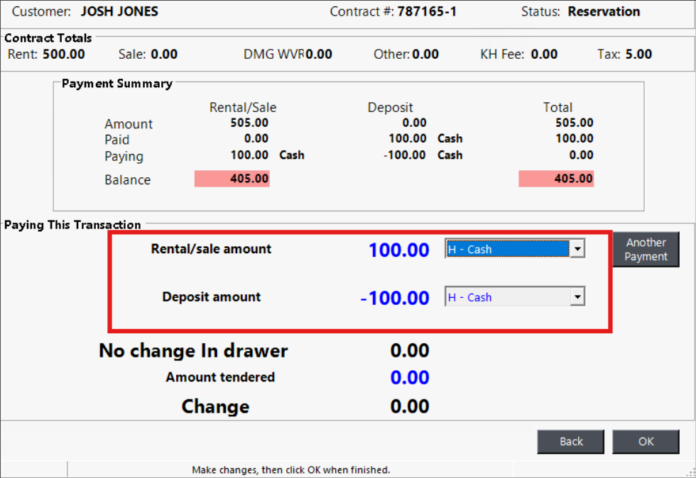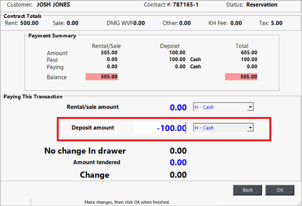 If you only want to refund the deposit and not move it to the rental/sale field, enter a negative amount in the deposit field and select the refund method you’ll use for the customer.