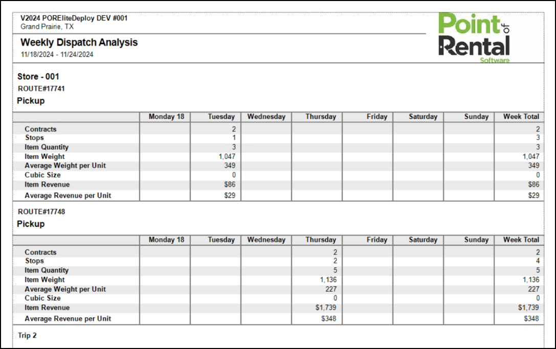 The dispatch analysis report is useful for viewing delivery/pickup statistics by store, route, or driver. It is always run for a week from the chosen date and can be grouped by store or driver. Visibility to the report can be restricted in the Report section of security.