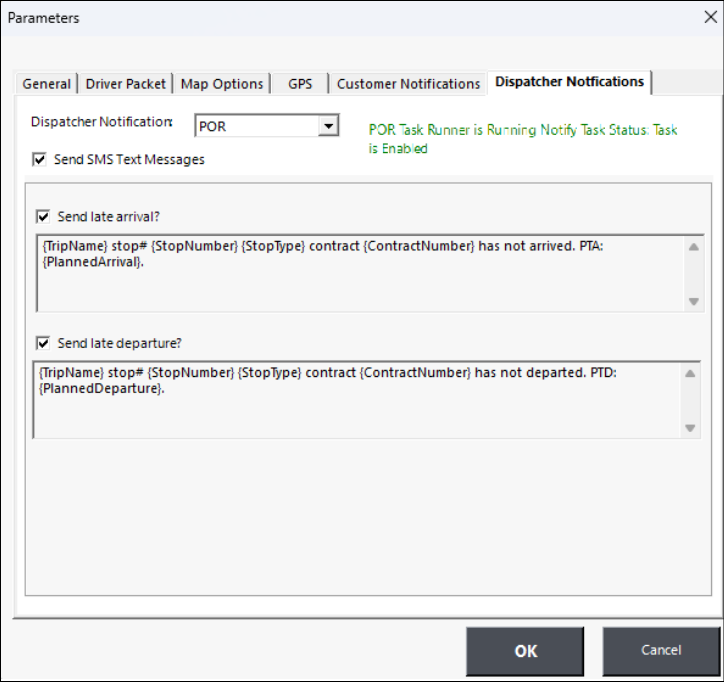 Send Late Arrival/Departure: Check the appropriate box to enable and write the dispatch notification message. You can add special fields to your notification by right-clicking the message window and selecting a special field to be incorporated into your message. These special fields will pull information based on the driver’s arrival or departure.