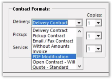There are many different contract formats to choose from. You can set different formats for delivery, pickup, and service contracts and set the number of copies to be printed.