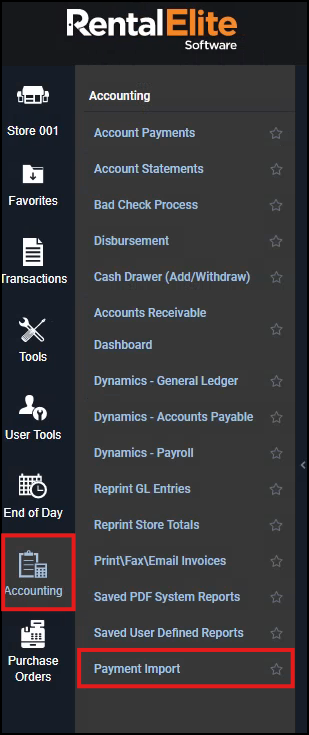 Elite: Left Menu > Accounting > Payment Import
