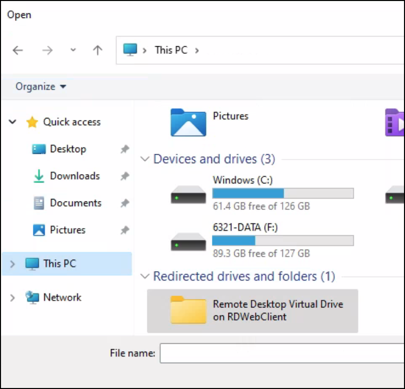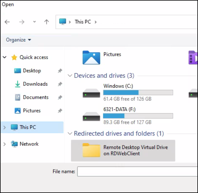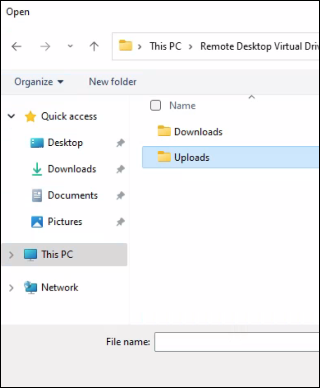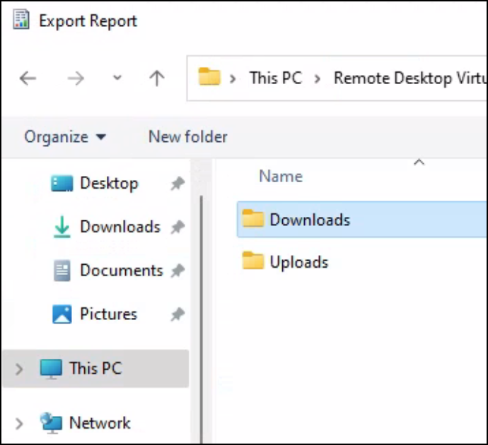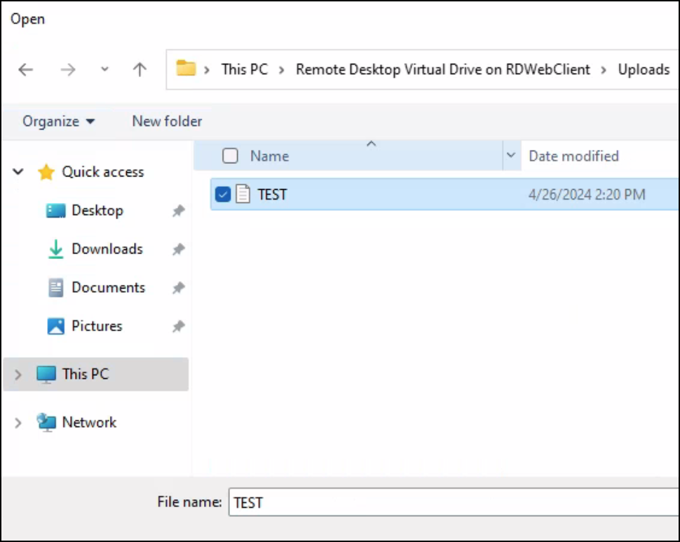 - Navigate to This PC > Remote Desktop Virtual Drive on RDWebClient > Uploads. All newly uploaded files will be moved to this folder on the POR Server.