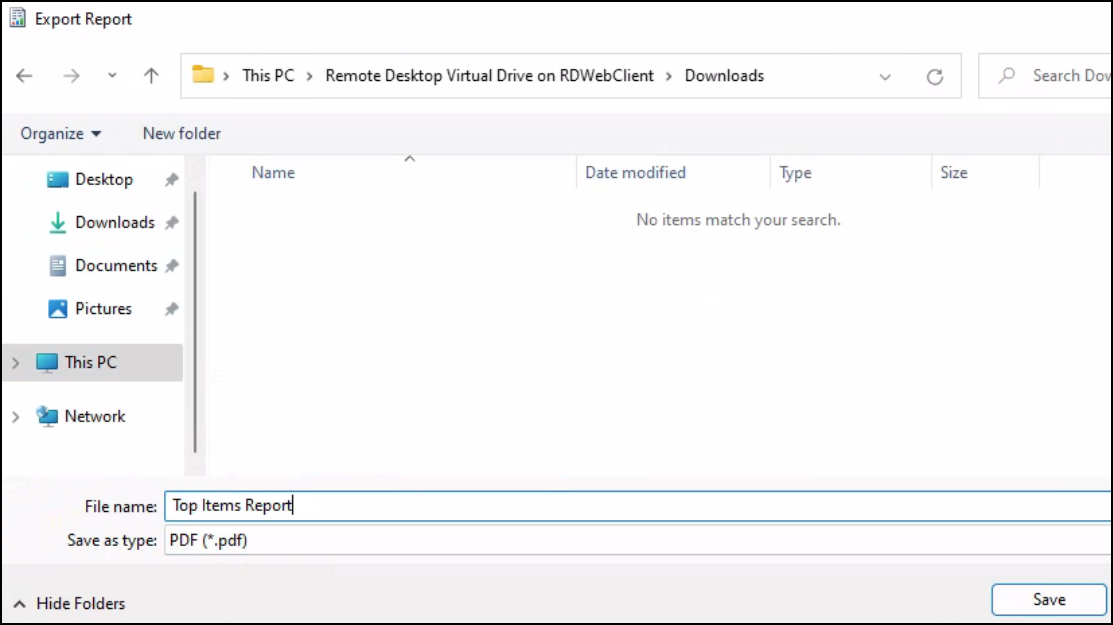 - Open the report or other file you wish to download to the local workstation used to access POR. In this example, it will be the Top Items report.