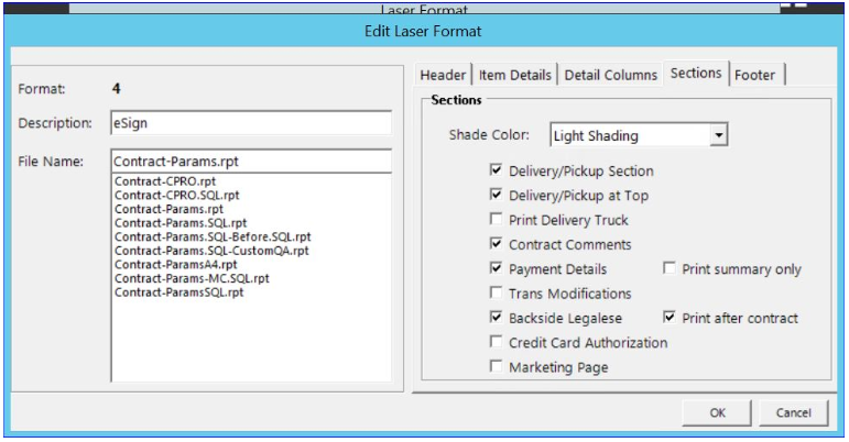 - Click on the Sections Tab and make certain the “Backside Legalese” and “Print after contract” boxes are checked.