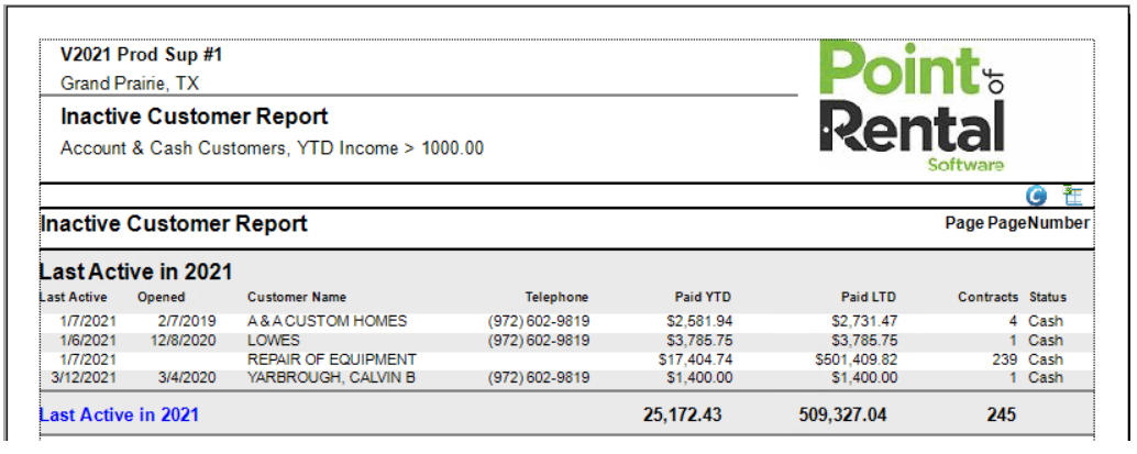 The Inactive Customer Report prints a listing of all customers that have not been active for a specified time. The report is sorted by a year last active and then either by customer name, key, number, or lifetime income.