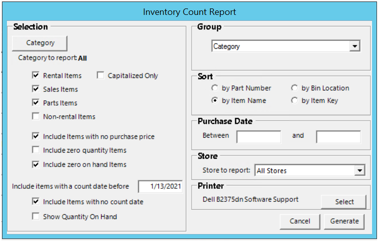 This selection produces a report that will aid in taking physical inventory counts of resale, parts, and/or rental items. When you select this option you will get the following menu: