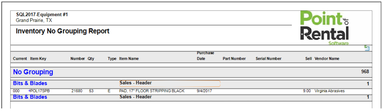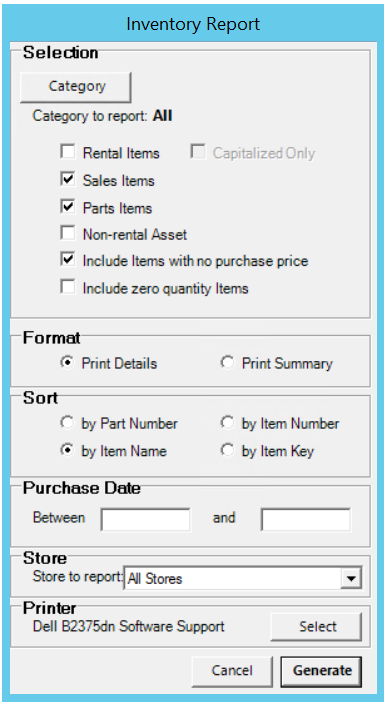 This selection produces a report of your inventory grouped by item category. The report will list, for each item, the item key, number, name, purchase date, purchase price, quantity, current store, home store, and serial number.