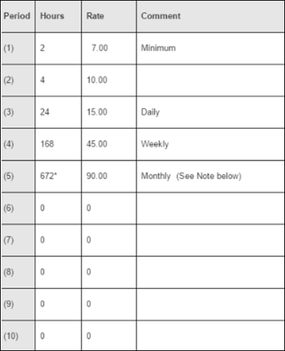 You can also define extra time charges by inserting a repeated or lower period in the rate table.