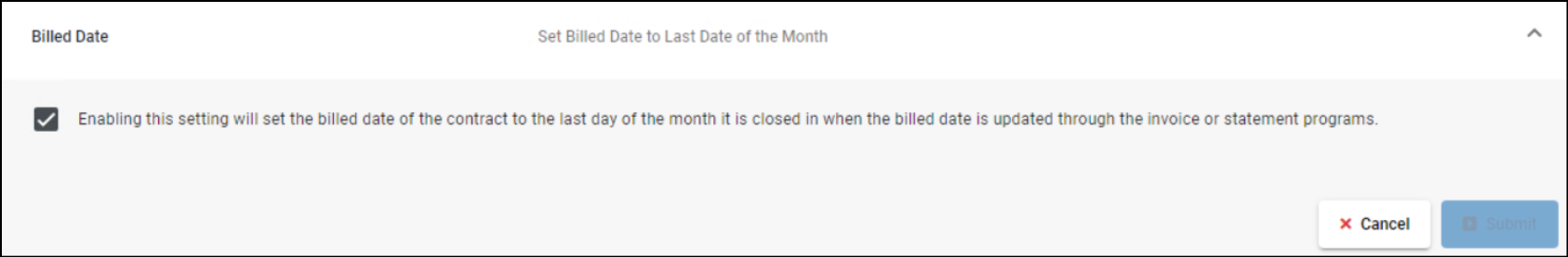 For users who would like the billed date to be set to the last day of the month, no matter what day it is run through the invoicing program, this configuration will need to be enabled. It is located in Transaction Configurations in the browser configuration setup. It is a company-wide setting. When enabled, the AR Dashboard will also use the billed date, rather than the closed date, to group contracts into their appropriate aging buckets.