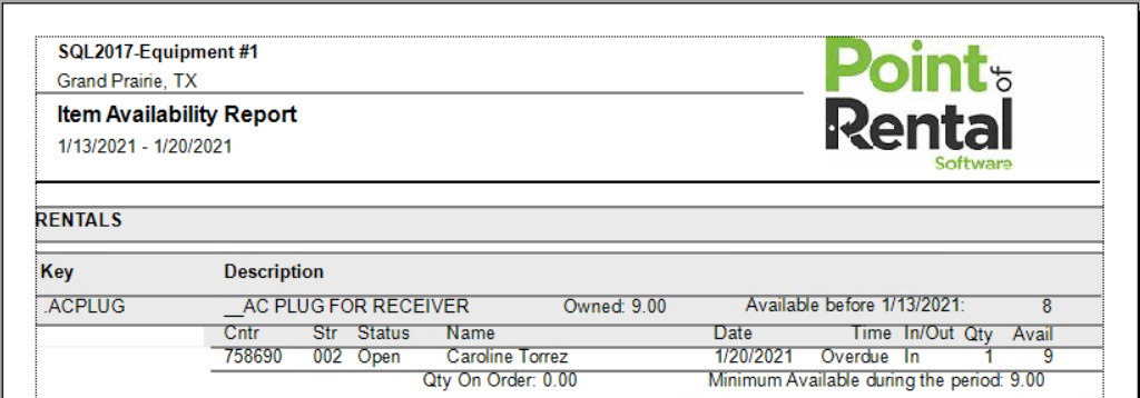 This option allows you to view item availability in mass. It displays all items that are currently on contracts and what is available for a certain time broken down between Rentals and Sales.