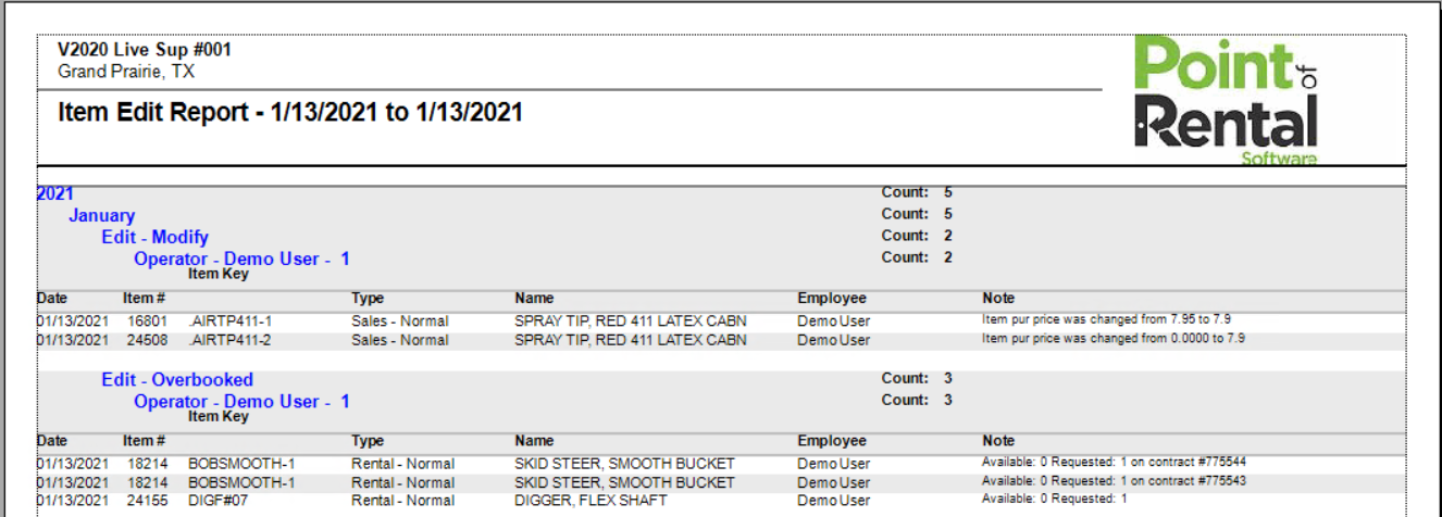 This report lists all the edits that have been done for the selected time grouped by edit type and operator. The report will look like this sample report: