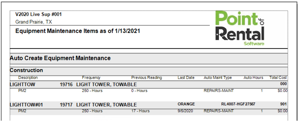 This report shows all the periodic maintenance that has been entered on inventory. This report will look like the following sample report: