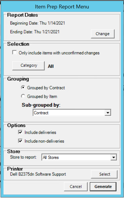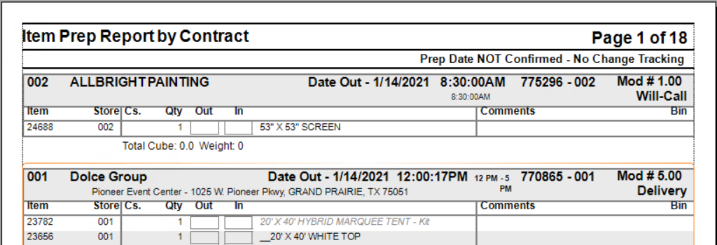 The Item Prep Report produces a report of all the items on reservation contracts. This report is used to determine all the items on reservations that need to be moved into the prep area. You can select whether items on delivery, non-delivery, or both contracts will be reported.