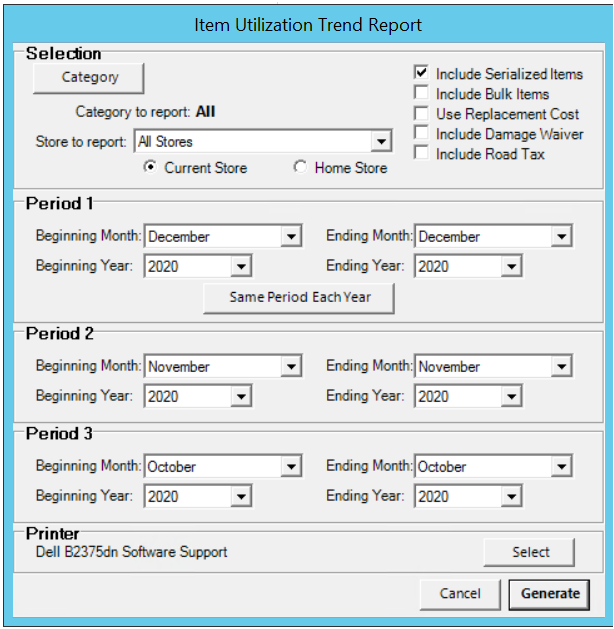 This analysis report shows utilization for three user-defined periods. The report is grouped by store and by category. You can “drill down” on the report to get the details of each category, each header item, and each item. The report gives the gross utilization and the weighted utilization (by inventory value) by groupings as well.