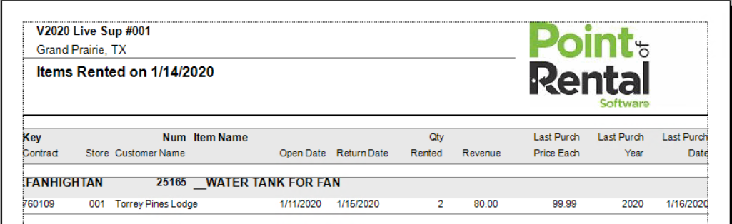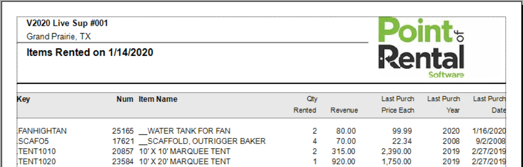 This report will show all the items there were out on rent at the end of business on the selected date. This is useful to find out whether an item was not on your premises. You will be asked whether to print the contract detail. If you answer “Yes” then each contract will be shown. If you answer “No”, then only the item, the times rented, and the total income will be displayed.