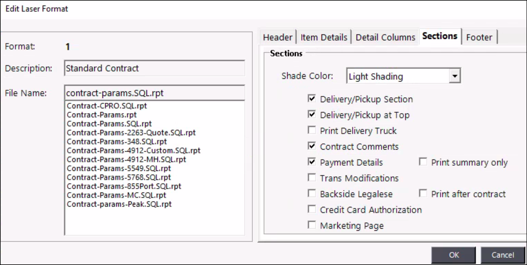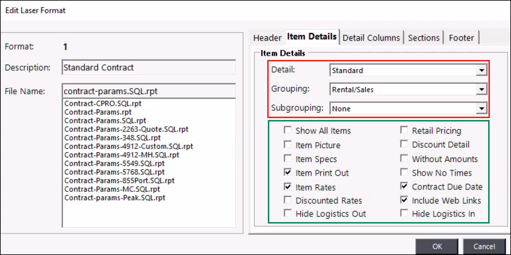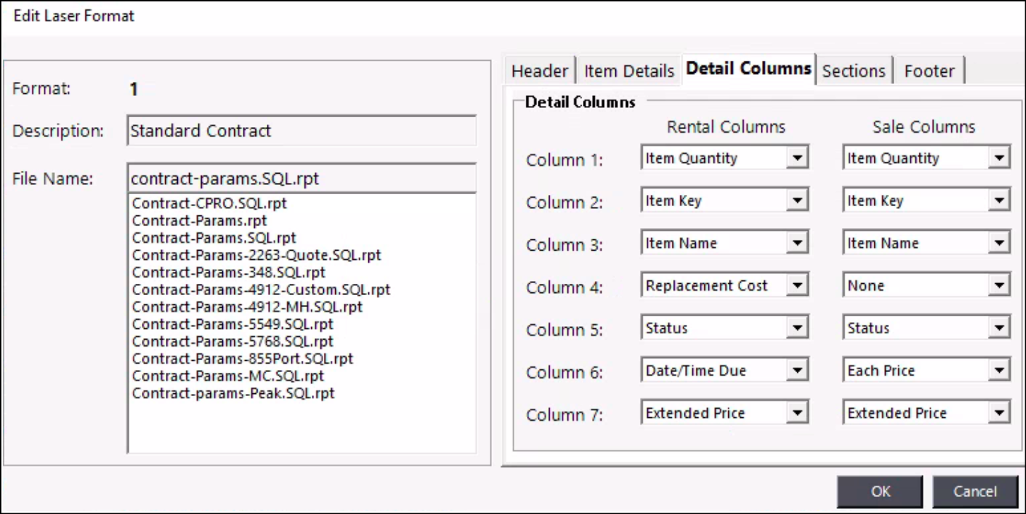 There are 7 columns in the standard contract format. The Invoice format has 6, and column 5 does not apply. Several of these columns have up to 35 different selections, or you can choose none to leave the column blank. You may set your rental and sales columns up separately. See the Definition-Item-Detail-Columns section at the bottom for descriptions of columns and fields.