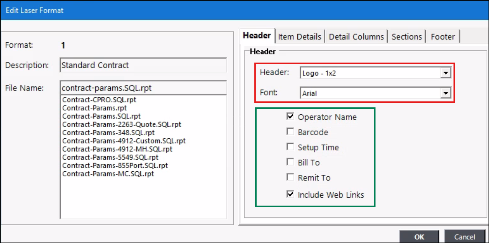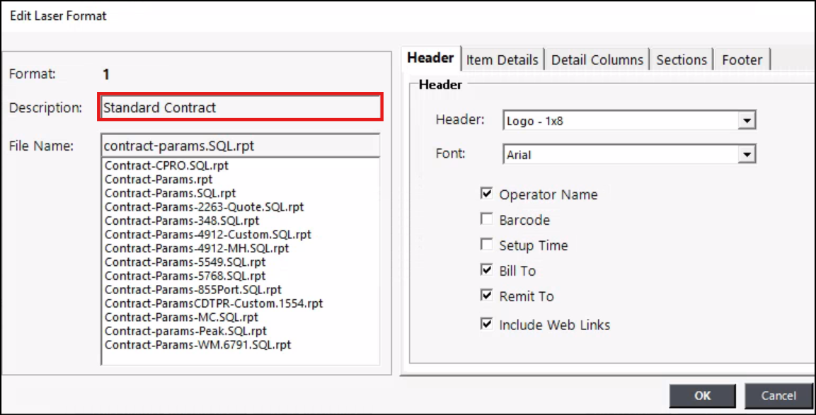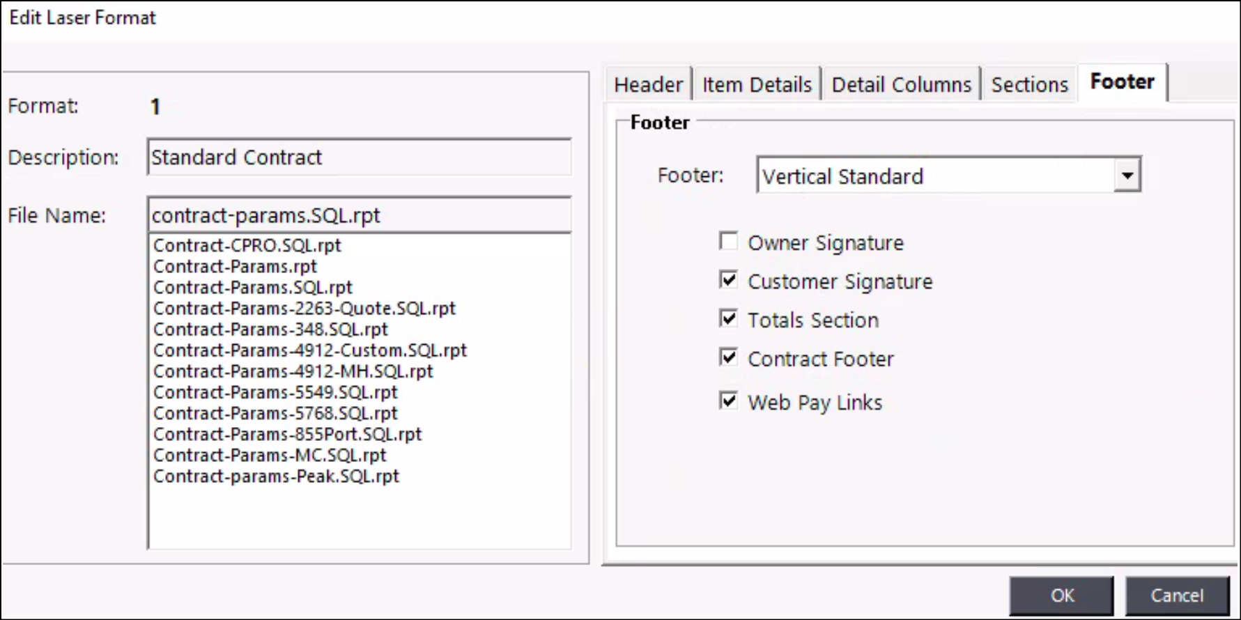There are 7 columns in the standard contract format. The Invoice format has 6, and column 5 does not apply. Several of these columns have up to 35 different selections, or you can choose none to leave the column blank. You may set your rental and sales columns up separately. See the Definition-Item-Detail-Columns section at the bottom for descriptions of columns and fields.