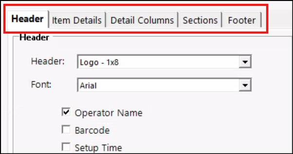 Notice the tabs labeled Header, Item Details, Detail Columns, Sections, and Footer. We will explore these below.