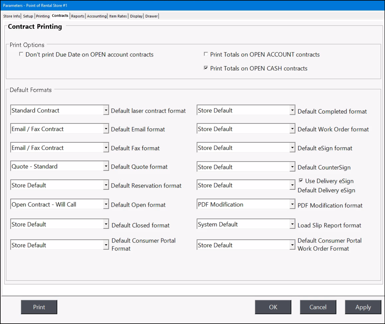 Open the Contracts tab. Here, you can select the default contract formats for open, closed, reservation, and other types of contracts.