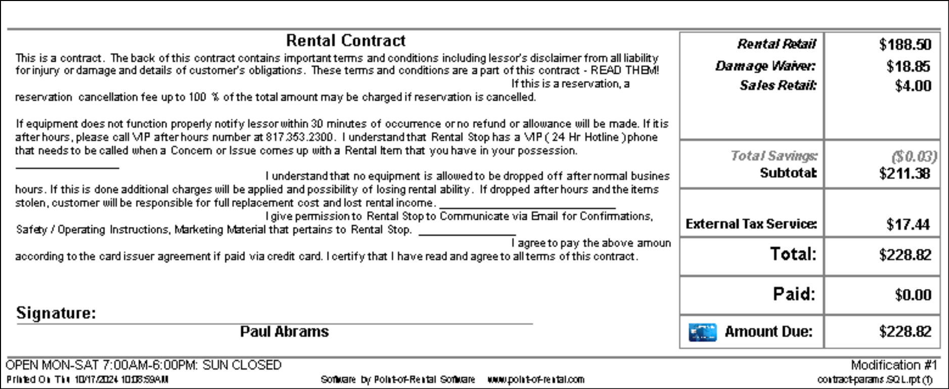 This is the standard footer used for most contracts. Totals Rental/Sales/Delivery/Damage Waiver/Item Percentage. This will show subtotals and amounts paid. |