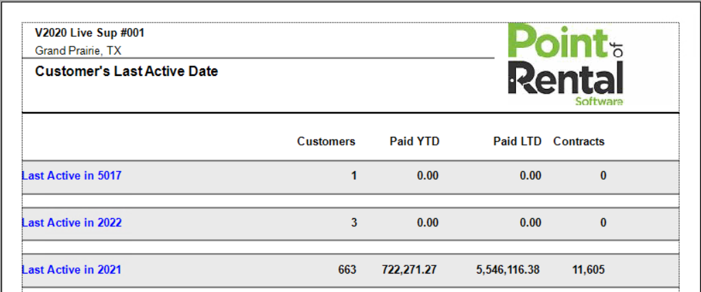 This report lists the number of customers, yearly income, lifetime income, and the total number of contracts for customers that were last active in each year. You can click on the yearly heading to drill down to see the listing of the customers. The report will look like the following: