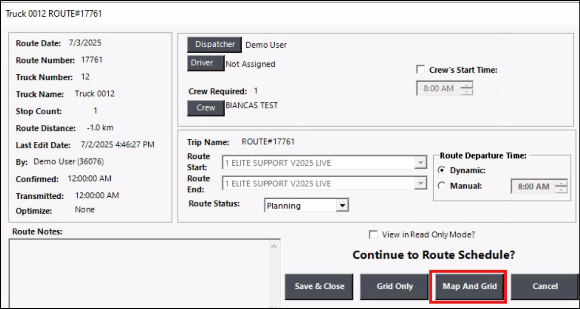 - Ensure the route is opened in Map and Grid.