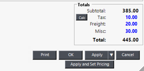 Apply - This button will save the changes that you have made to the purchase order on your hard drive. You can use this button to assign a purchase order number before you are finished writing the purchase order. This is helpful when you are calling in an order to a vendor and you want to give them a purchase order number without writing the entire purchase order while the vendor waits.