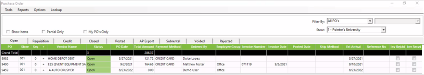 This article will discuss purchase orders, including accompanying tools, reports, and processes. The display will default to the open tab. You will be able to view all (Open, Pending, Credit, Closed, Posted, AP Export, Sub Rental) purchase orders at a glance by selecting the appropriate tab.