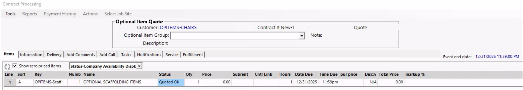 4. Select Optional Item Group from the drop-down menu. *Note -- This is the item that you will add to the contract.