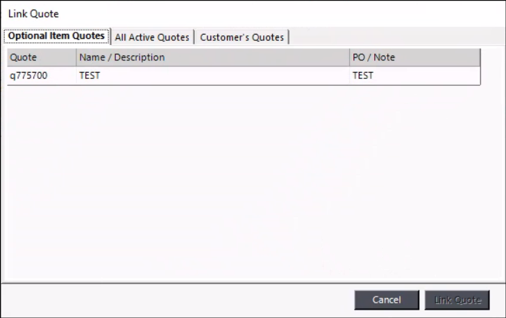 5. Select a quote you want to have listed as optional items and click link Quote.