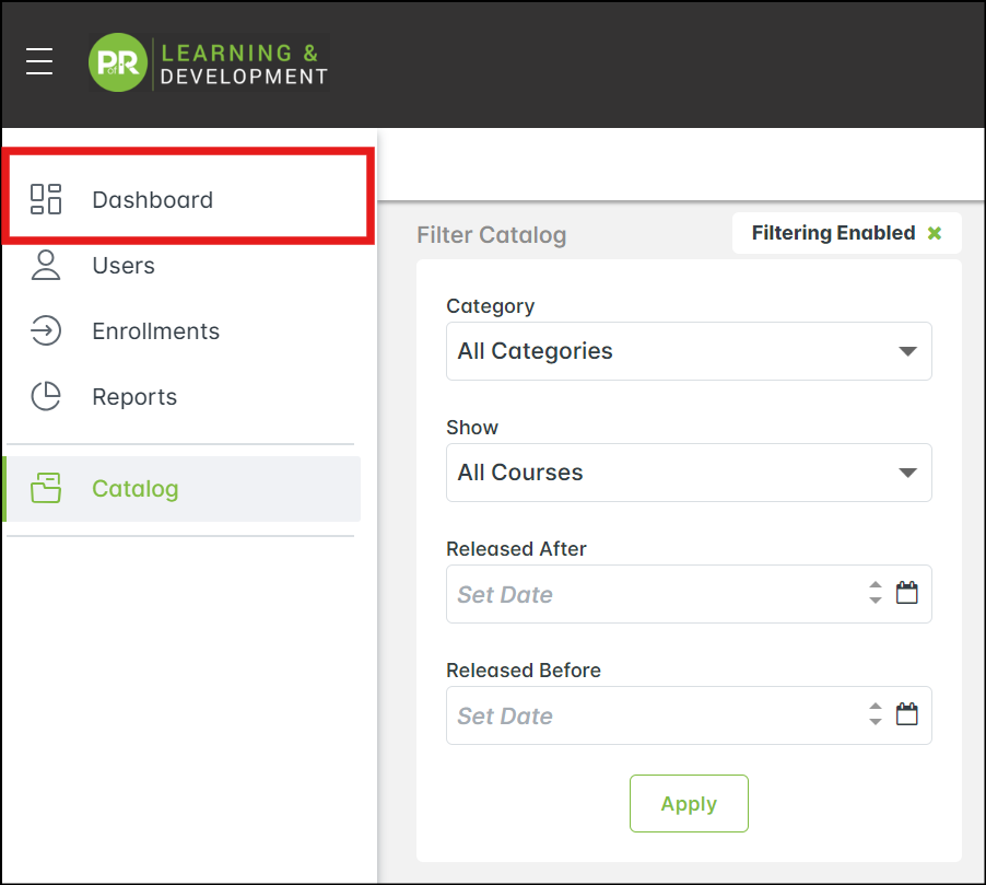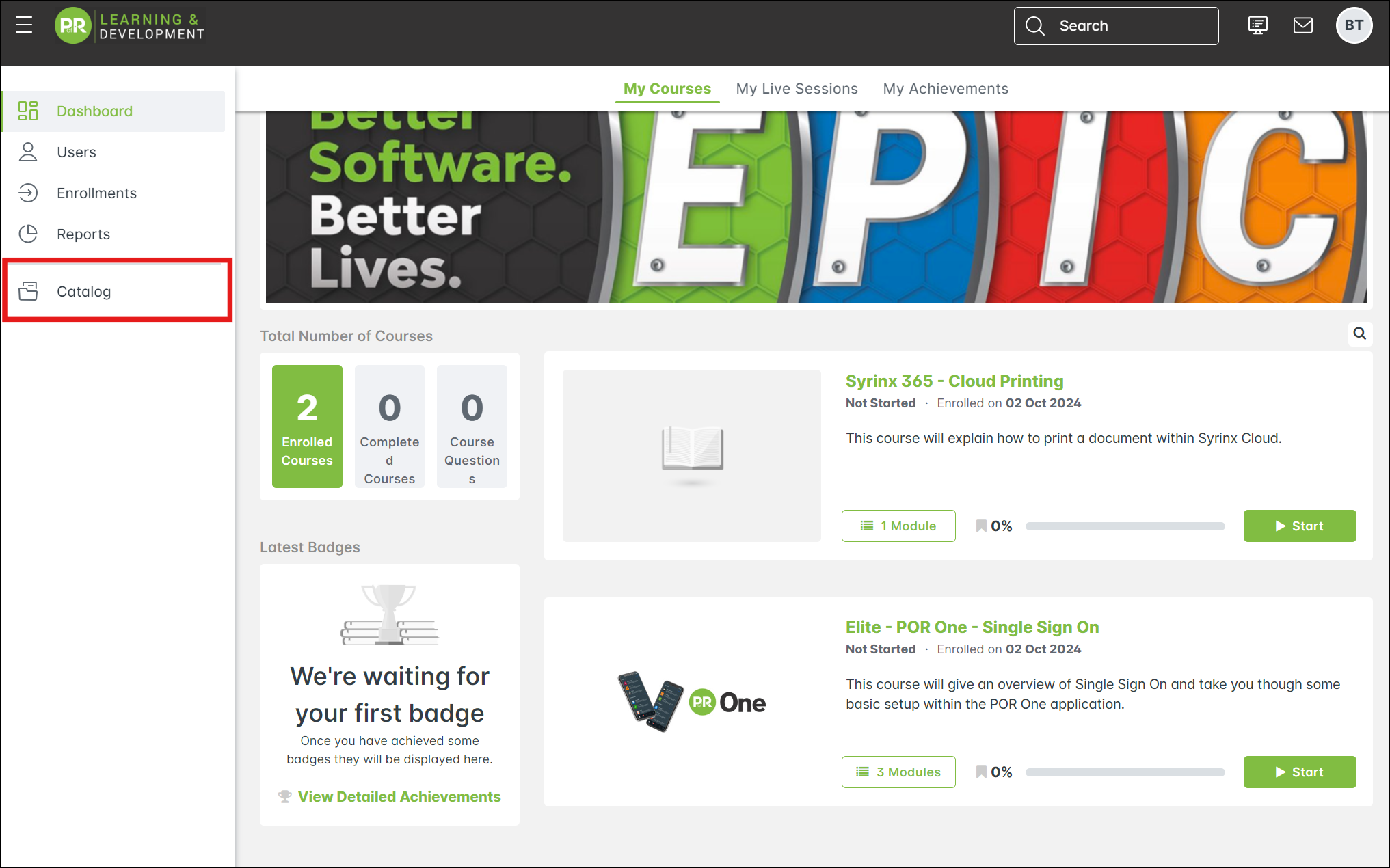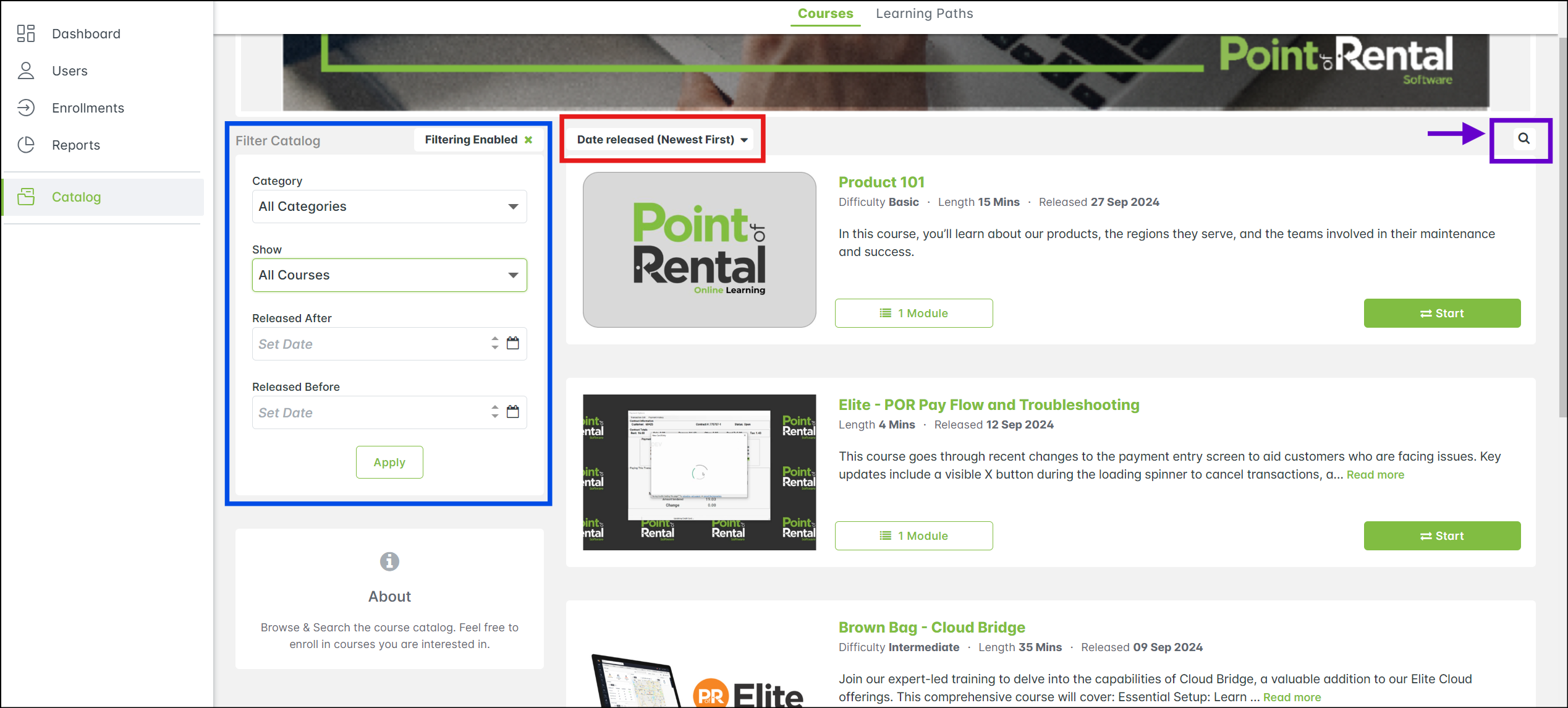 With the new catalog, you can browse and enroll in courses more easily by clicking on the Catalog at the top or in the left-menu. Please note that only users who have been set as Managers can view the left menu. To learn more about Manager access, see the article POR Academy.