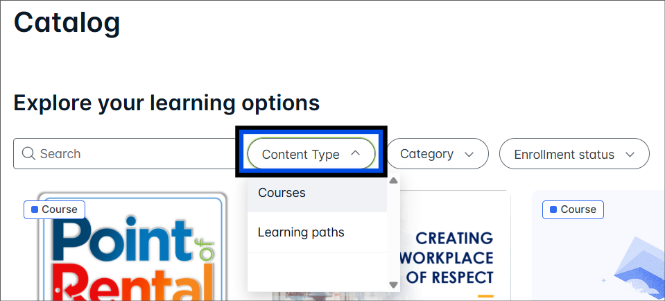 To find learning paths, use the Content Type drop-down and select Learning Path.