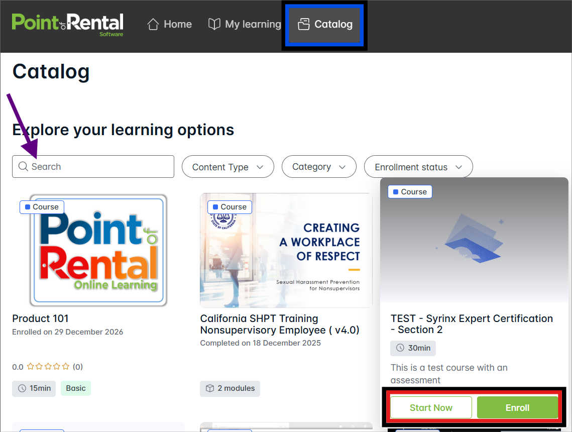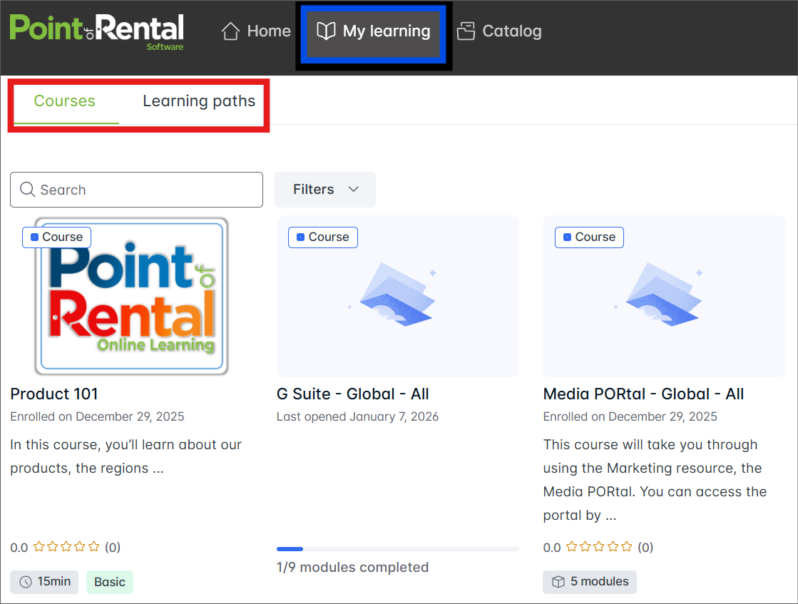 The Catalog is where you can browse and discover all available courses and learning paths in the POR Academy.