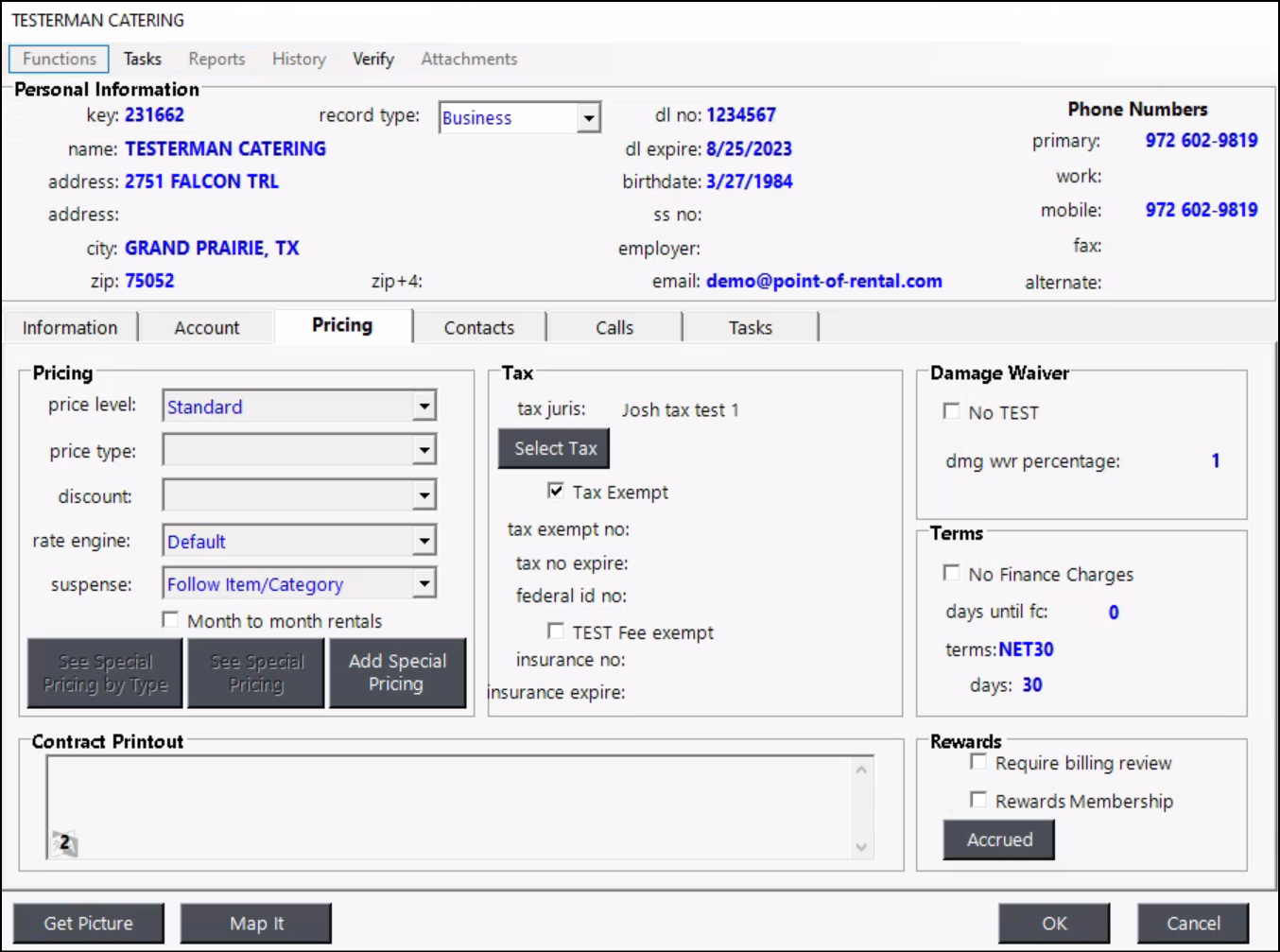| Tax Exempt | Checking this box will mark the customer as TAX EXEMPT. No sales tax will be charged on the contracts. | |