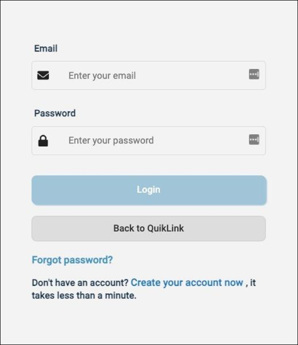 This will display our Login Prompt, which supports existing consumer logins, registering for an account, and resetting their password. If they do not want access to the Consumer Portal they can press "Back to QuikLink".