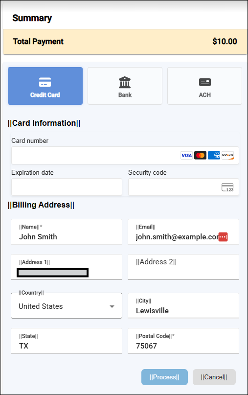 This will load POR Pay and prompt the consumer to validate payment details to process their payment. They can press the Process to complete the transaction.